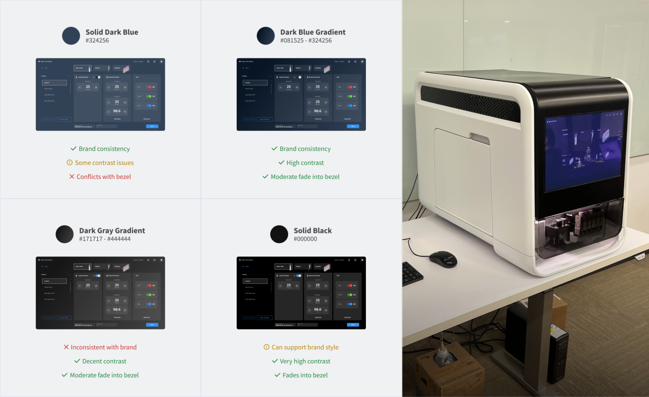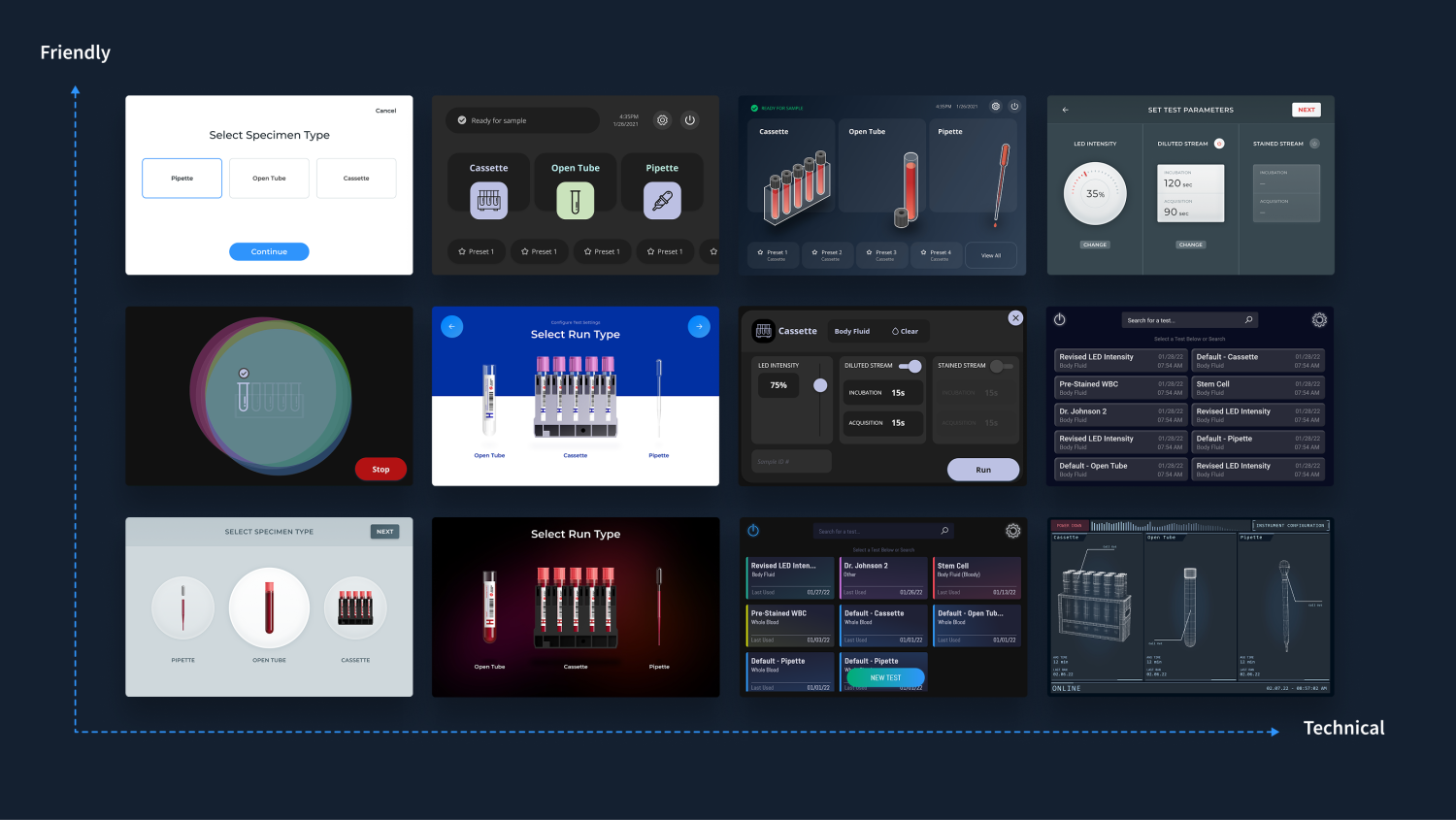 - Early on-device implementation: Getting software onto the real display quickly to validate what pixels actually looked like on the hardware and to test UI-enabled physical actions like open drawer, insert tube, close drawer