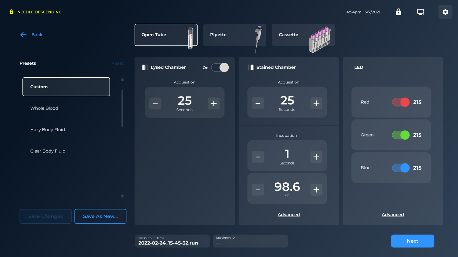 To do this, we elevated the primary job, running a sample, with a quick path to the three run modes and saved test parameters. Secondary functions were intentionally tucked away to reduce clutter and help users focus on the task in front of them.