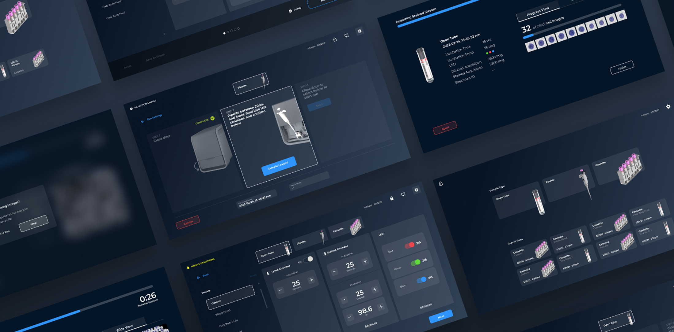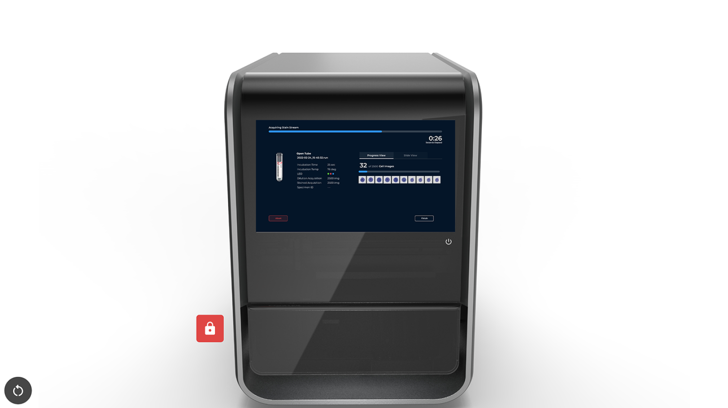 The second anchor point was the page designed to provide feedback as a sample was being run. This experience presented the opportunity to design what would otherwise be a utilitarian countdown in a way that visualized what the analyzer was doing. The result was a strengthened link between the physical and digital parts of the system and quicker familiarity between users and the imaging process.