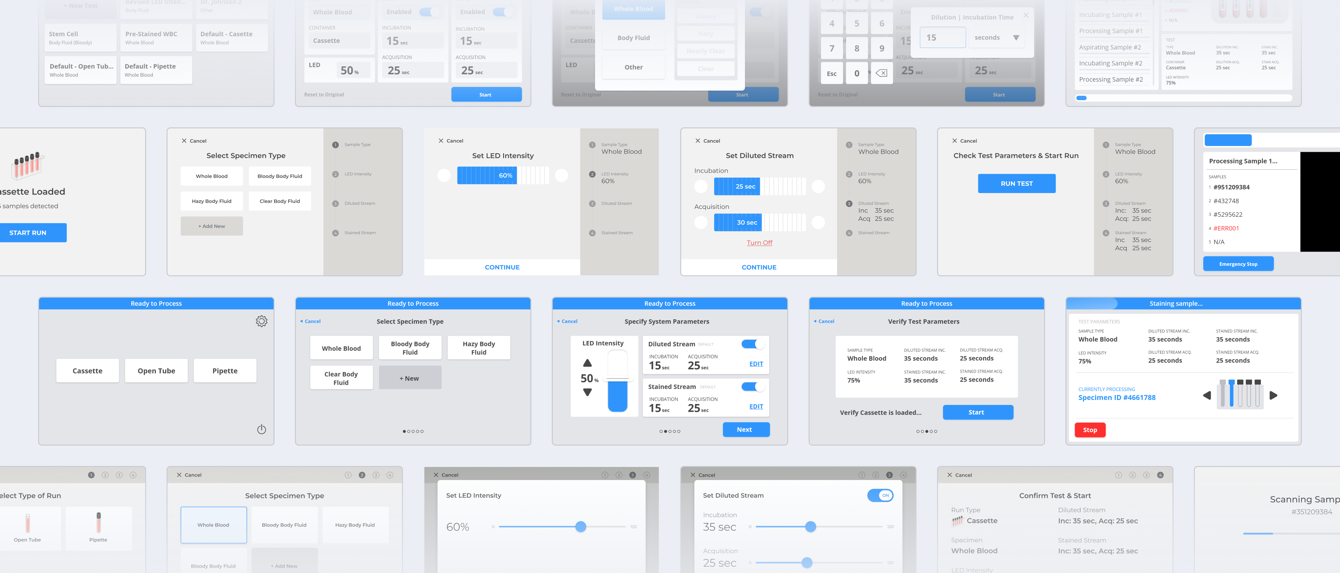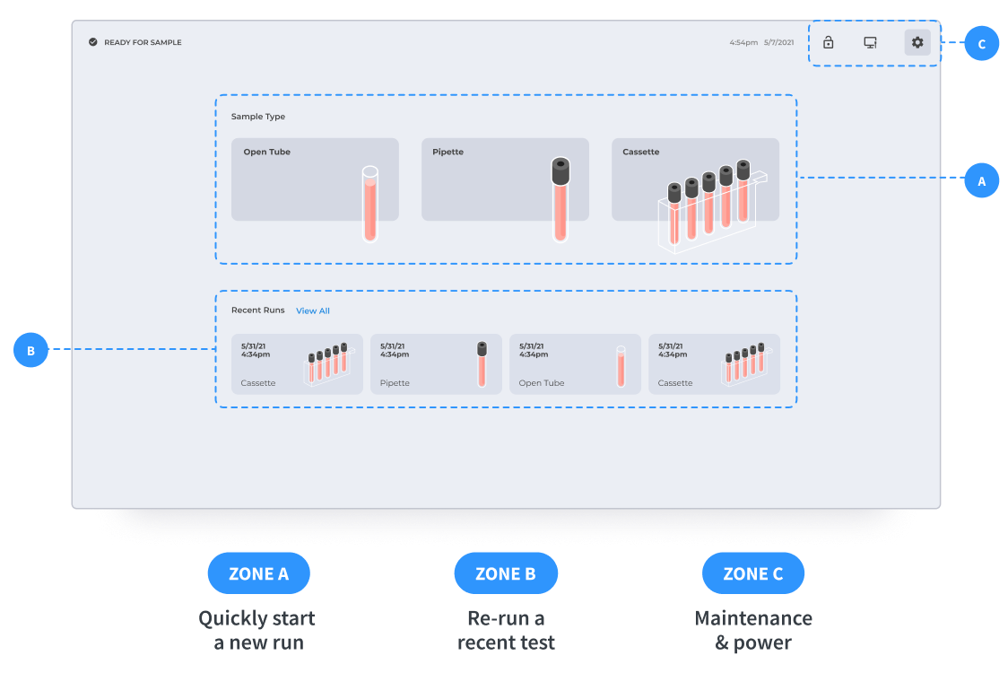 The RUO’s interface and screen design didn’t exist in a vacuum but was to be integrated with a physical analyzer in a lab setting. Our team needed to consider additional factors including: