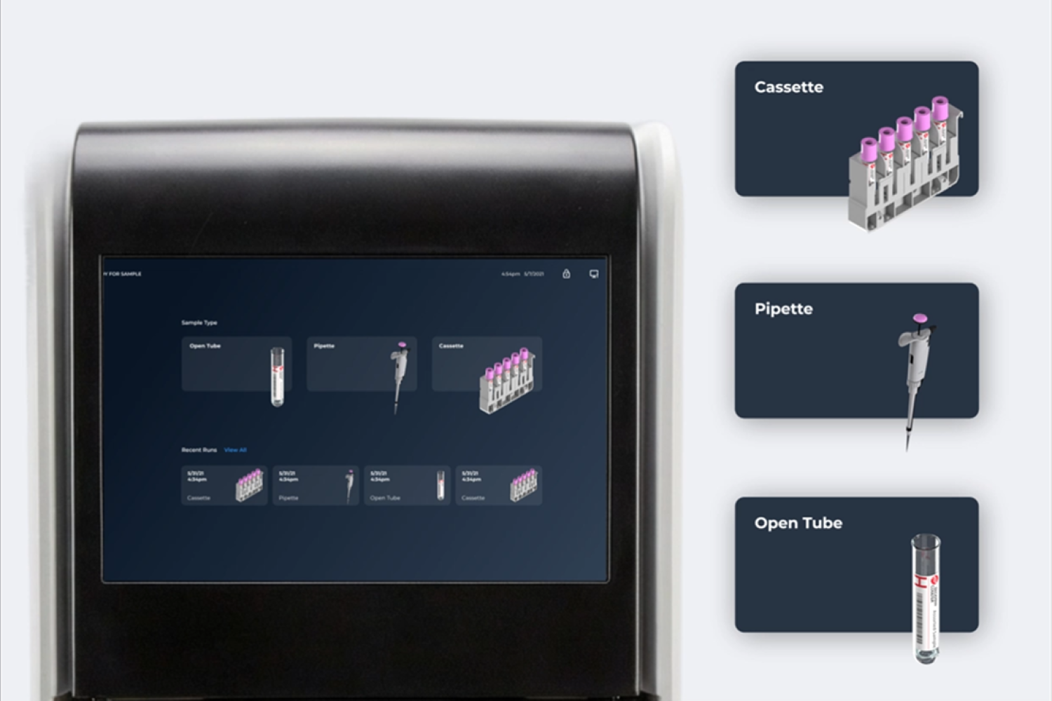 - Running a test using either a cassette, single tube, or pipette