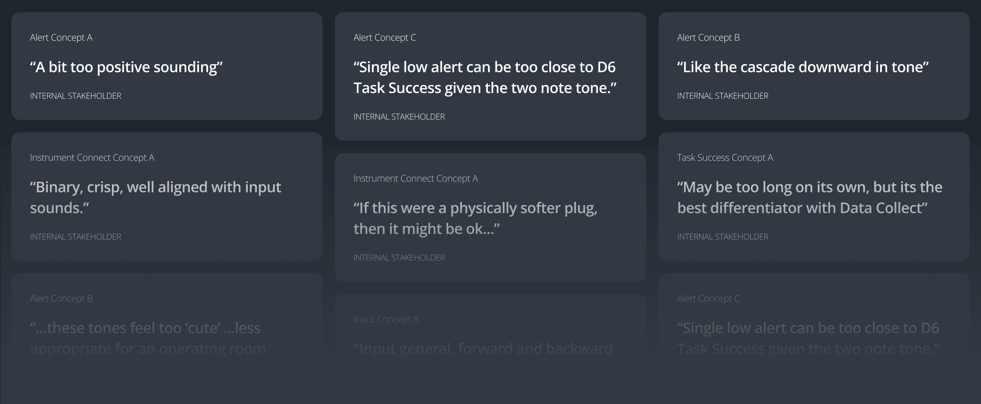 Through the conceptualization process, we gathered structured feedback from stakeholders to shape the sonic system towards usability and brand goals. Concept sounds were tested to assess clarity, emotional tone, and effectiveness. Stakeholders assessed sounds through a framework of numeric scoring and descriptive language, enabling fast, aligned decision-making. This input helped refine everything from tone hierarchy to timing—ensuring the final system wasn’t just well-designed, but truly usable in the environments it was built for.