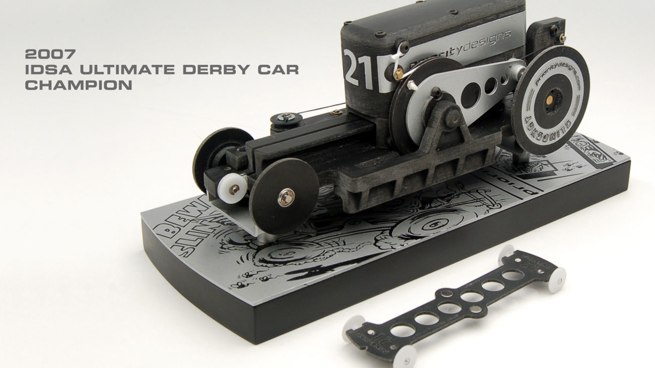In 2006 and 2007, we built a series of gravity powered race cars to compete in the IDSA Ultimate Derby Car Challenges. Held as an annual national competition, the IDSA Derby is a no-holds-barred contest to see who can build the fastest gravity racer. The only rules are that the cars have to fit a designated size and maximum weight, and they must be powered only by gravity. The real point of the contest is to creatively interpret the rules without breaking them.
